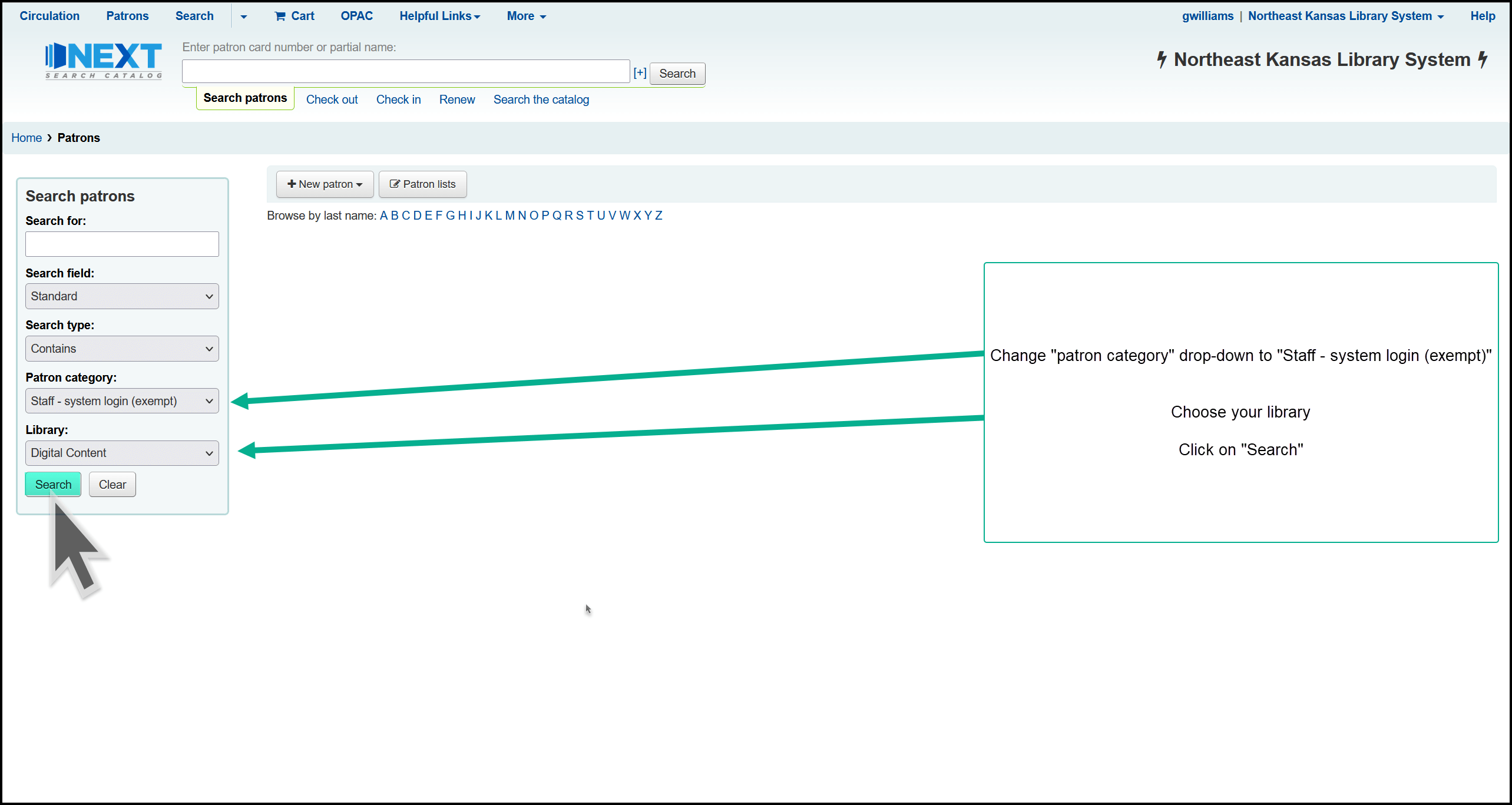 A: The dummy accounts will remain in place. All you have to do when you hire new staff is create an account for them, determine their account security type (Director, Technical services, Circulation, Aide, or Self-checkout), and then pass that information along to nexthelp@nekls.org. This is actually easier for NEKLS staff than the old method of creating a new staff account.